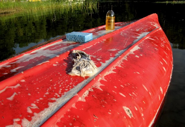 Using a sponge, Soak, and some elbow grease, she got her bright red canoe into tip top form.