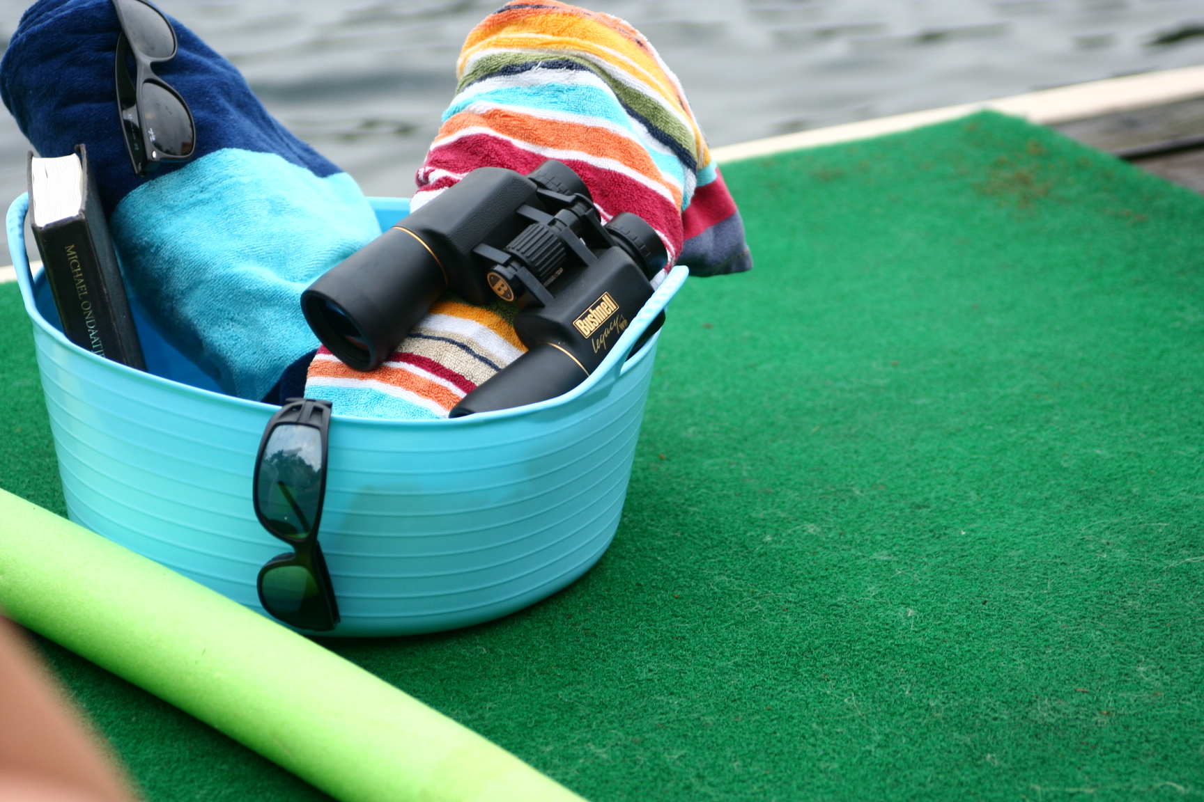 Phil holding some cottage essentials: dry towels, a good book, sunscreen and a pair of binoculars. We were lucky enough to spot a beautiful loon and haron while we relaxed on the water.