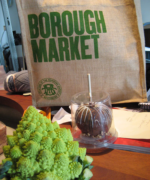 On my regular trip to the market Saturday, I realized that I was already quite familiar with Paul’s products. In addition to securing a candy apple, I stumbled upon the most elegant form of cauliflower, cauliflower romanesco. It was love at first sight, and dinner Sunday. Yum. All were carried home in my favorite market bag, from Borough Market, in London England.