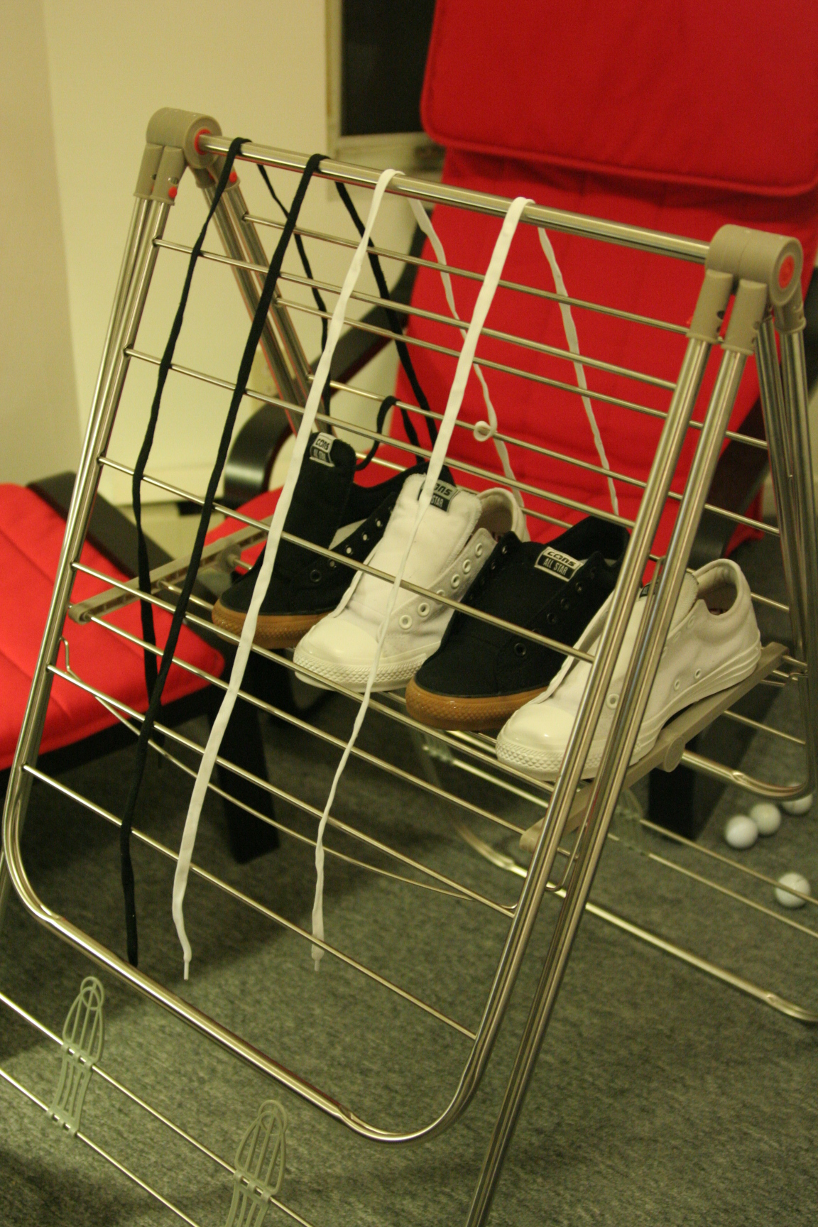 Put on a drying rack to dry. If you had soaked your shoes, you may want to stuff a sock inside for the first little bit to help maintain the shape of the shoe. Success. Shoes look brand new again.